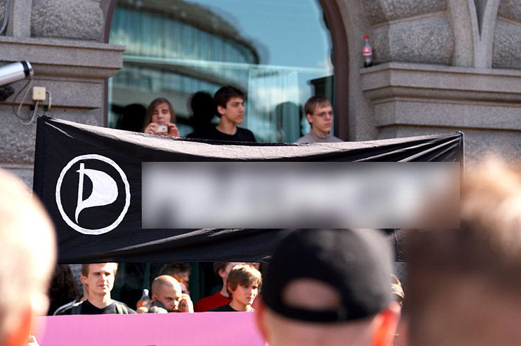 Name the political party involved in this demonstration (Name blurred out).